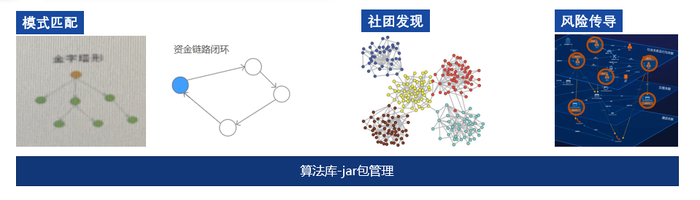 相比图指标,图算法是对关联动作进行更深的挖掘。像模式匹配,就是经过业务定义之后,去筛选资金链路闭环的一些风险模式,是一种一对多对一的模式,洗钱也会出现很多闭环的风险模式,在定义好之后都可以放在图谱的数据库中进行跑批。第二种社团发现,用算法进行社团分割,形成一个团给业务去核查分析,通过机器学习的方法从关联图谱中自动发现群聚社团。社团发现既可以是半监督式的,即以一些少量的标注或标签作为种子,也可以无监督式的。最后在担保圈还有一些风险传导的算法。这些我们都是根据特征模式总结抽象,最后融合到系统功能中去。