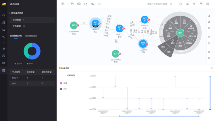 第二个应用是图分析,包括交互式分析、智能化分析、性能优化。邦盛科技知识图谱平台集成了很多可视化的分析工具来提供简单易用的交流,如时序分析,时序分析能在小额高频问题上观察到入账出账时间的关联,聚合汇总能结合业务经验,展示条边关系。另外,平台设置了即时算法,还有路径分析、环路查找、异常识别等。在分析的基础上,邦盛科技还会根据实际业务经验做很多数据调优,尤其是对于演变结构的精简,因为知识图谱产生到最后还是要服务于决策,服务于业务,这才是最终目标。