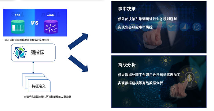图指标是经过图分析后,直接提取的一些图谱网格特征,并形成的一种计算指标。这个计算指标会和专家规则的指标联动,对上层决策进行调优。图指标比较简单的一个用法是用相近的关联关系去触发黑名单,但更多的时候我们会把图指标和专家规则类的统计指标、模型特征做融合决策。需要说明的是,融合决策不是指孤立式决策,而是指在编译层就做融合,也就是说融合决策在图指标阶段是做在一起的。图指标主要应用有两个,第一种是事中的决策,第二种是事后的分析,分别是实时和事后,也是目前图指标的两个典型用法。