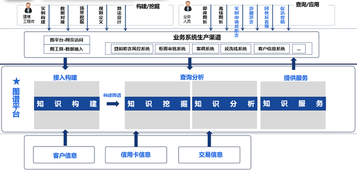 整个图谱的应用架构上,最左边的是给建模工程师使用,右边是给业务人员使用,结合业务上的各个生产渠道,比如风控面反洗钱安全系统,再聚焦一些业务场景,比如反欺诈、涉赌涉诈、团伙套现进行一些机器的分析,还有一些离线的分析。下面对应的是我们的一些功能,然后建模工程师将左侧知识构建的数据源处理好后,定义好这个节点边属性关系,交给业务人员进行一些知识的挖掘、知识的分析,这个过程中会用到我们事先定义好的一些功能算法,最后按照图谱的能力对外进行发布。