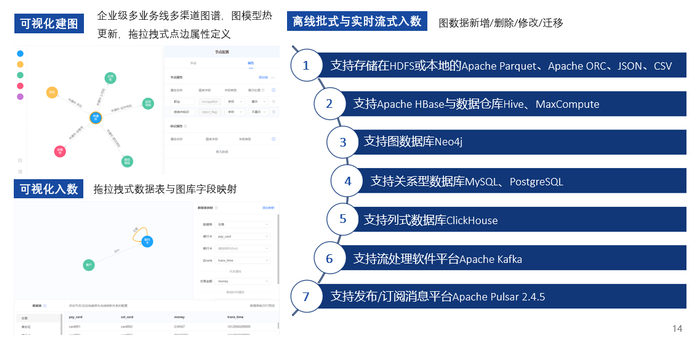 图谱平台在应用方面有很多核心功能,第一个核心功能是图构建。图构建有三种方式,包括可视化建图、可视化入数、离线批式与实时流式入数。无论是建图或入数,都会涉及数据共享,邦盛科技知识图谱平台作为中央级、一体化平台,基于多业务条线的需求,实现了权限隔离和数据共享的功能。在入数方式上支持多种,包含批式、流式的方式,还有数据源,比如常规的关系型数据库入数,中间件kafka入数等都是支持的。
