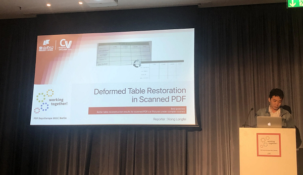 金山办公技术总监熊龙飞在大会上发表题为《PDF内变形表格的识别与还原》(Deformed Table Restoration in Scanned PDF)主题演讲,向在场嘉宾展示了金山办公利用深度学习技术在PDF领域实现的技术突破,并以变形的扫描件PDF表格还原作为主要案例进行了技术思路介绍。