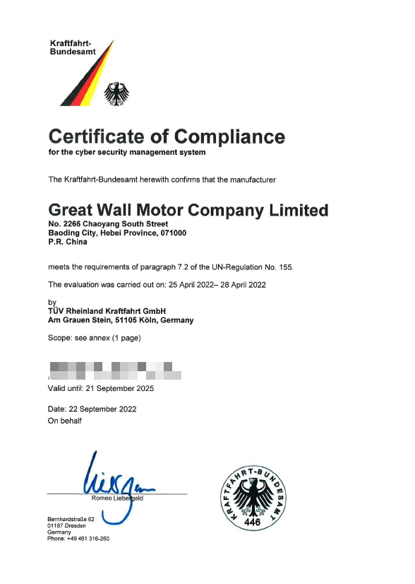 近日,长城汽车股份有限公司(以下简称“长城汽车”)成功获得德国联邦机动车交通管理局(KBA)颁发的UN R155(联合国欧洲经济委员会第155号法规)车辆网络安全管理体系(Cybersecurity Management System, CSMS)符合性证书,成为国内首家获得德国KBA颁发的此项认证的公司。以国际标准定义车辆信息安全起点,打造全球一线高品质产品,长城汽车征战海外国际市场再添重磅利器。