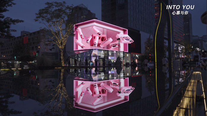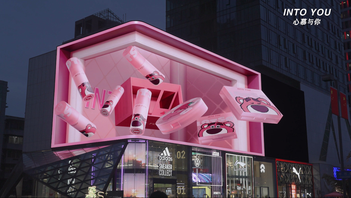 此外,INTO YOU品牌还深谙营销法则,从利用圈层平台进行内容种草收获大量用户的认可,再到内容为王通过联名等手段不断进行品牌力的构建一气呵成。就以此次INTO YOU皮克斯草莓熊系列的出圈来说,INTO YOU将目光锁定在年轻群体中讨论度颇高的太古里3D屏幕,以一次出其不意的企划,让所有人都在为草莓熊的可爱欢呼的同时,也让INTO YOU产品又一次成功走进了消费者的心中。