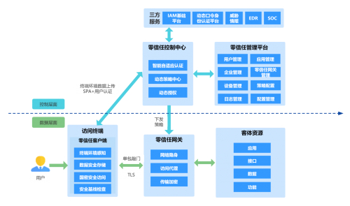 飞天诚信作为全球领先的身份安全厂商,结合自身24年身份安全行业的经验,以及近几年对零信任领域的研究成果,采用SDP软件定义边界技术、IAM身份识别与访问控制技术,结合商用密码技术,推出零信任解决方案。解决方案以身份安全为核心,具备多源信任评估、动态访问控制、智能自适应认证、网络隐身、可信业务访问等安全能力,同时可扩展移动认证、单点登录、可视化安全监控大屏等功能,可以帮助企业解决传统的网络安全边界理念与防护手段不足的问题,从而构建以身份为中心的零信任安全体系,营造安全、可信的网络环境。