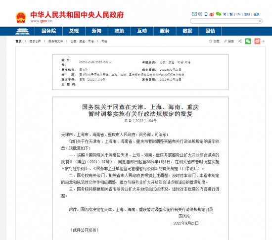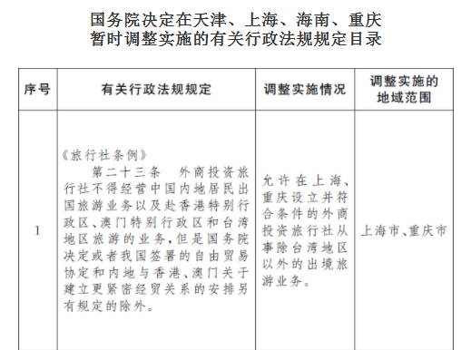 近日,国务院官网发布《关于同意在天津、上海、海南、重庆暂时调整实施有关行政法规规定的批复》。其中提到,允许在上海、重庆设立符合条件的外商投资旅行社从事除台湾地区以外的出境旅游业务,引发旅游业界关注。
