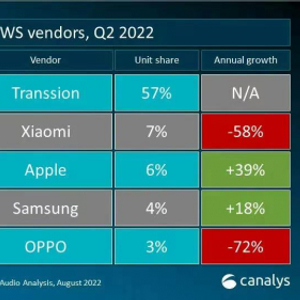 全球知名市场调研机构Canalys公布了2022年第二季度TWS市场研究报告以及全球TWS重点市场厂商排名情况。报告显示,在非洲,传音以57%的市场份额稳居非洲TWS品牌市场出货量第一。