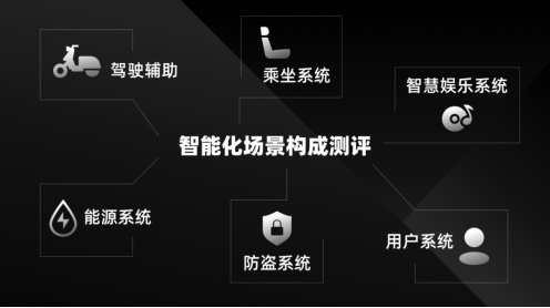 智能化场景构成测评分为驾驶辅助、能源系统、防盗系统、乘坐系统、智慧娱乐系统及用户系统六个方面。