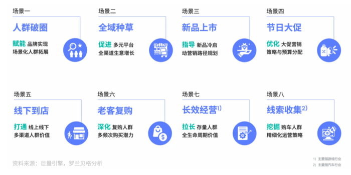 《人群资产经营方法论》显示,结合不同品牌方的增长诉求,巨量引擎归纳总结了八大应用场景:人群破圈、全域种草、新品上市、节日大促、线下到店、老客复购、长效经营、线索收集。