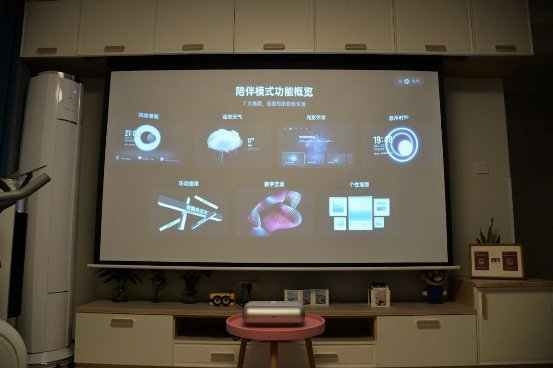 试想一下,有了一台超短焦投影之后,你家里的书架、床头柜等地方都可以摆放它,甚至连以前的电视柜上面也可以摆放,想放哪里放哪里。由于是贴墙使用,除了不用担心空间问题,你更不用担心未预留吊装孔、画面遮挡等在以前的传统长焦投影仪安装和使用过程中出现的各种难题。