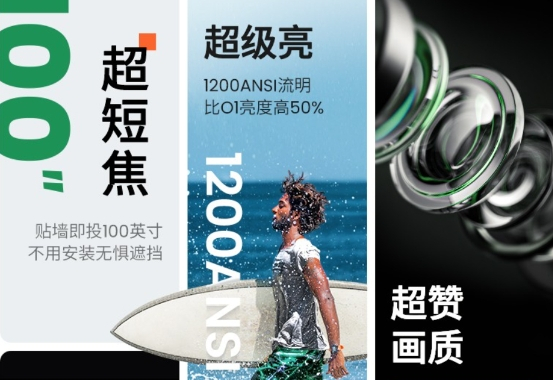 传统长焦投影一大痛点是投射比问题,这是因为大部分人家里的客厅里几乎很难有足够的空间投射出巨屏画面,就连目前普通家用投影仪也需要距离墙面2米以上才能使用,要想投射出百吋画面则需要距离墙面三米开外。