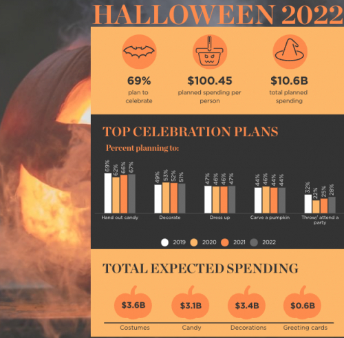 随着文化融合和时间推移,原本这个主题为灵异、恐怖的节日,如今已演变为有趣、热闹的狂欢盛典。根据NRF(美国零售联合会)2022年度万圣节调查:海外消费者计划庆祝万圣节的主要方式包括分发糖果(67%)、装饰家或院子(51%)、装扮(47%)、雕刻南瓜(44%)、举办/出席派对(28%)。用来购买糖果、装饰品、贺卡和服装的平均花费大约为100 美元,达到此项调查有史以来的创纪录水平。