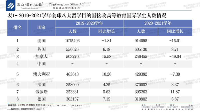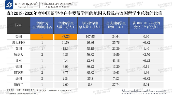 2019-2020年度,中国仍然是最大的留学生来源国,中国学生的前五大留学目的国为美国、澳大利亚、英国、加拿大和日本。
