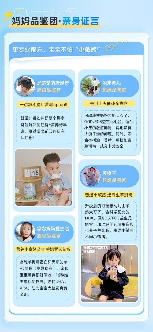 面对本次[双重配方]精研升级可瑞康幼儿山羊奶粉,成分党妈妈们都十分严谨,经过给宝宝喂养亲测,给出了多个角度的品鉴证言,力求为各位宝妈甄选出好消化吸收,真实能呵护肚肚,助力击退“小敏感”,帮助宝宝健康成长的专业山羊奶粉。