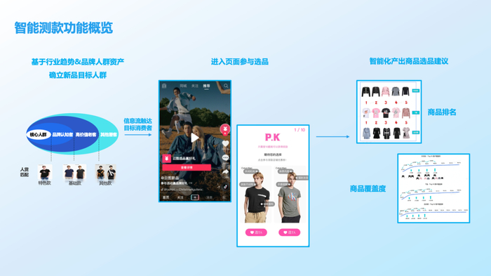 当品牌在面临新品上市或大促选品等针对多款商品的上新决策时,可以通过「新品实验室」的「智能测款」功能向目标消费者进行定向调研;品牌在后台设置问卷并通过信息流触达目标消费者,消费者会参与至多10轮测款选择,而后系统自动得出商品最优排名;这让品牌能够从消费者意向出发,确立优质独立货盘,从而真正打动消费者直接产生消费行为。