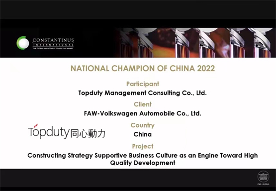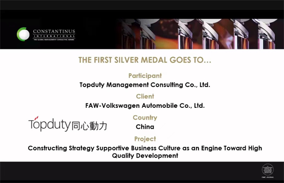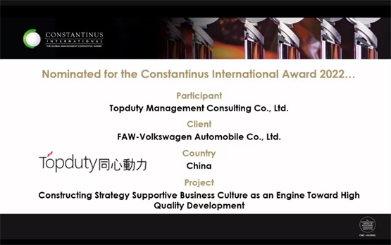 经过国际评委团的严格评选,同心动力管理咨询凭借“构建战略支持型文化,打造高质量发展引擎——一汽-大众面向2025的企业文化与成本文化管理咨询”项目案例,从全球近30个国家的百余个参评案例中脱颖而出,并最终摘得三项大奖“2022年度国际君士坦丁奖银奖”(全球共两家)、“2022年度国际君士坦丁奖国家金奖”、“2022年度国际君士坦丁奖提名奖”。