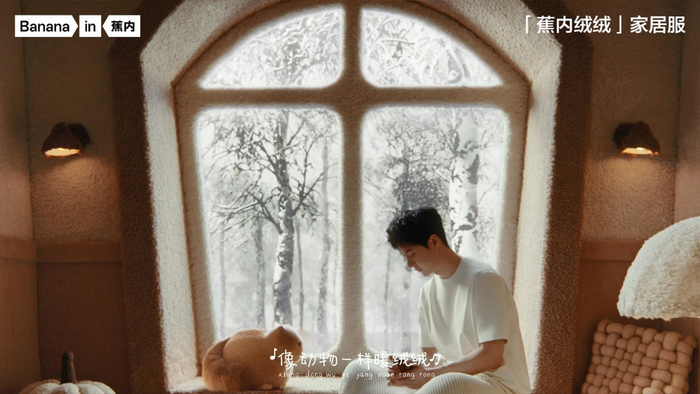 就在粉丝戏言“这简直是世界上的另一个我”时,镜头一转,动物们向一博递上了自己的“保暖装备”。换装后的一博卸下在外的紧绷,倚靠在猫绒绒和熊绒绒的身边休憩。惬意放松的模样,与屋外的飘雪林海形成鲜明对比。伴着《玛丽有只小羊羔》的轻松旋律,短片的谜底也正式揭晓:像动物一样暖绒绒的,正是蕉内绒绒家居服。