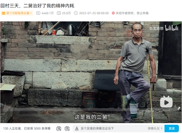 7月25日,B站上一则名为《回村三天,二舅治好了我的精神内耗》的视频火遍全网,UP主“衣戈猜想”透过文学性的旁白与画面,记录下二舅的一生。看过后,许多网友都说自己被治愈了,正如UP主自述一样,“四肢健全,上过大学,又生在一个充满机遇的时代,理应度过一个比二舅更为饱满的人生”。
