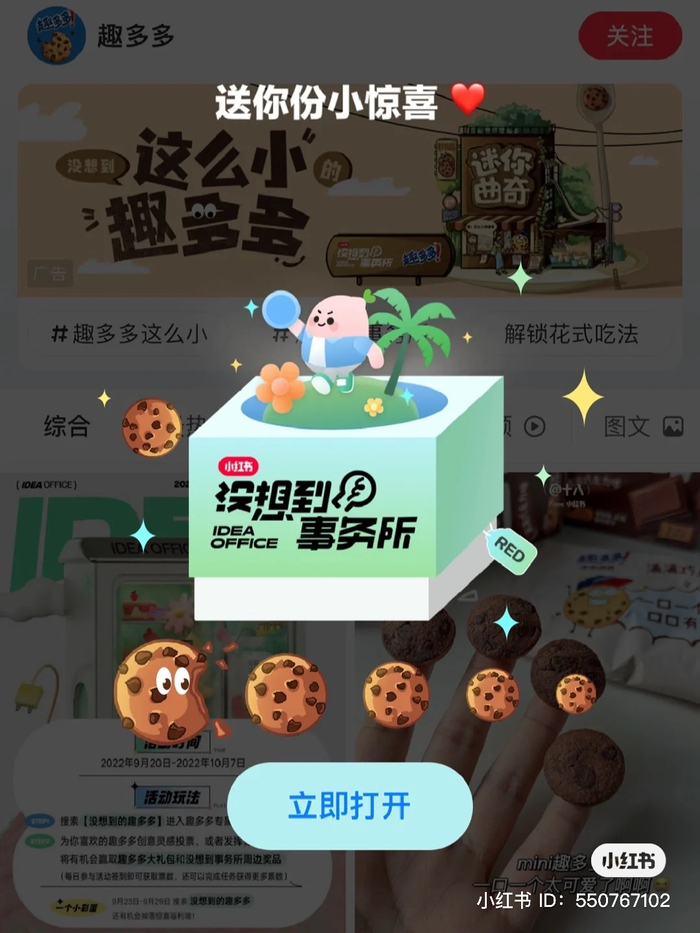 本次活动还贴心设置了小彩蛋,搜索#没想到的趣多多和#没想到事务所相关话题,就有2000份趣多多迷你曲奇随机掉落,轻松拿下小红书惊喜盒子!博主们都在种草的趣多多mini新品,说不定下一秒就能被你炫到嘴里!