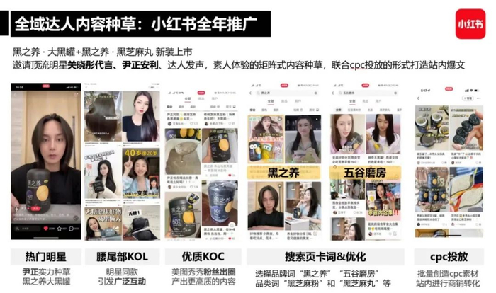 小红书是内容种草的天然平台。五谷磨房采用了“明星示范+KOL专业内容+KOC真实体验”的模式: