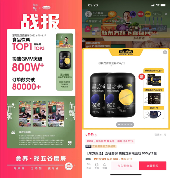 “比如火爆的东方甄选,其他品牌还没有将其作为重点直播间合作时,我们就已经非常敏锐地察觉到了其内容优质,并在4月份布局;比如抖音平台的商家自播,那时候正值疫情爆发,平台推出“云逛街”时,很多品牌还在观望,五谷磨房就率先入驻并介入学习开始运营。”
