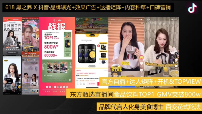 在抖音做口碑营销,五谷磨房采用了品牌广告+达人种草内容+效果广告引流+直播电商(自播/达播)组合运营。