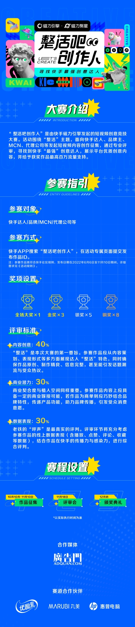 据悉,参赛者只需在近1个月的活动期间内,通过快手APP搜索“整活吧创作人”,并在活动页面提交发布作品ID即可参赛。最终,专业评委将综合所有参赛作品的内容创意、商业潜力、数据表现三个维度进行评审,选出全场大奖及金银铜奖等多个奖项。