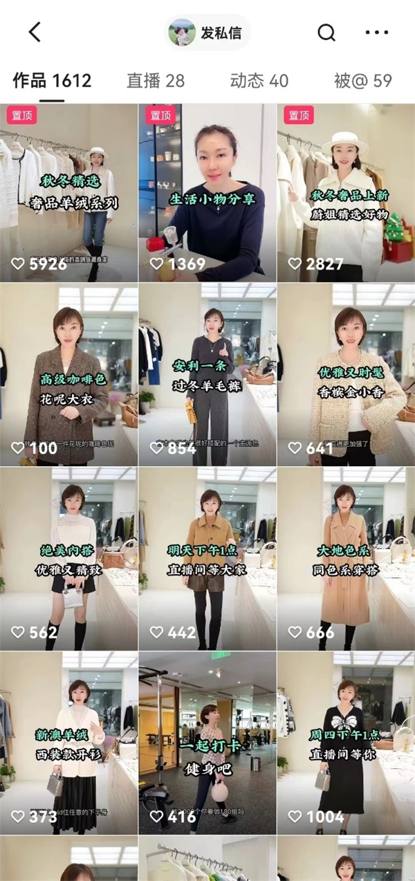 初入平台,陈蔚先以中客单价产品“试水”,质优价低的服饰受到不少粉丝的喜爱。账号起量后,陈蔚便尝试推荐更高品质的高客单货品,如进口羊毛羊绒大衣、桑蚕丝服饰等。“我觉得产品的质量好,它就能打,我们家的高客单价产品同样性价比很高。”
