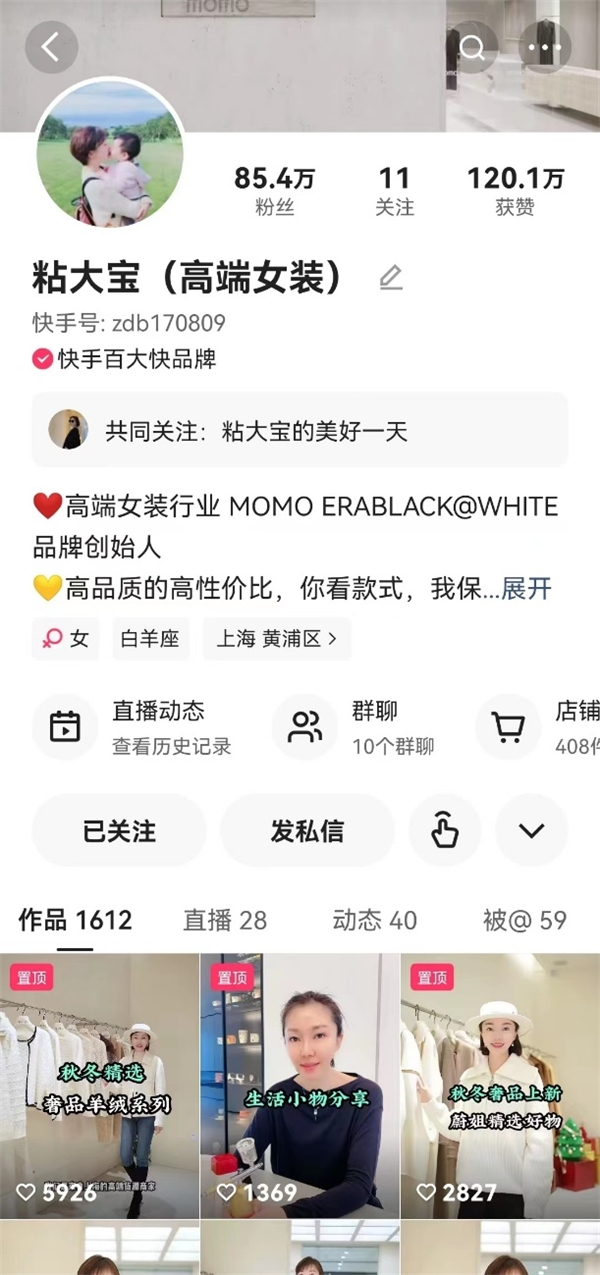 在硬核产品质量打造的生意“护城河”内,MOMO ERA保持高频上新节奏,不断以新品激活私域流量池,实现品牌的长效经营。在陈蔚的快手账号“粘大宝(高端女装)”(快手号:zdb170809)中,MOMO ERA品牌实现了超1300万的月GMV,在此背后,是陈蔚对品牌能力的层层搭建,也是她对快手信任电商的不懈探索。