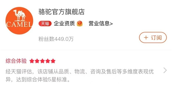 骆驼天猫旗舰店,商品、服务、物流三项4.8以上,综合五星资质。