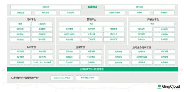 应用商店是青云 PaaS 平台里的一个核心功能。这个应用商店最早源于青云公有云 AppCenter——为第三方开发者提供的开发框架。第三方应用可以快速基于这个框架云化应用,同时也支持计量计费、边缘管理的能力,第三方直接把应用放在青云云市场里做商业化运营即可。后来青云把 AppCenter 剥离为单独的组件,也放在 KubeSphere 容器云平台上。