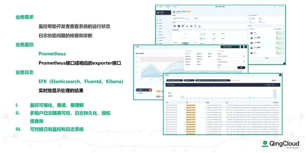 日志也非常重要。刚才北京银行的专家分享到他们用到 EFK,青云平台也深度集成了 EFK 组件来做日志的实时处理。用户可以通过项目、业务和租户等不同视角查看,也可以通过网络字段查询。因为很多银行都有自己的日志中心,用户也可以把日志放在日志中心里。