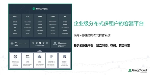 青云已全面布局云原生,提供端到端的云原生支撑能力,目前有 6 款产品在 CNCF 云原生全景图里。其中,KubeSphere 容器平台,依托于容器编排的实施标准 K8s进行构建的,支持异构部署,不管是什么样的底层基础设施,企业都能够构建这一套云原生平台。同时,KubeSphere 也支持多集群管理与异构管理,具有向导式 UI。最大的优势是解决了原生 K8s 操作不易上手、体验不足够好、学习成本较高等问题。