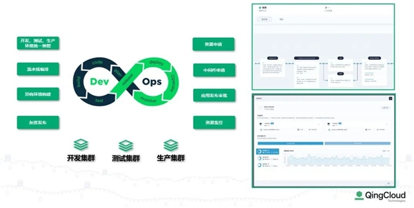 三是安全性,外包人员在传统操作时,难免有机会接触生产环境,这就会存在一些未知的安全风险。青云解决方案将开发环境、预发布环境、生产环境全部容器化,统一管理,给不同人员分配不同权限,通过流水线的方式全部串连。中间的环节、不同的环境之间,加入准入准出的审批策略。上线到生产环境出现问题的话,还可以通过平台发布的版本号回滚。这是 DevOps 里非常典型的场景,青云通过解决方案整体打包,统一提供 DevOps、灰度发布。