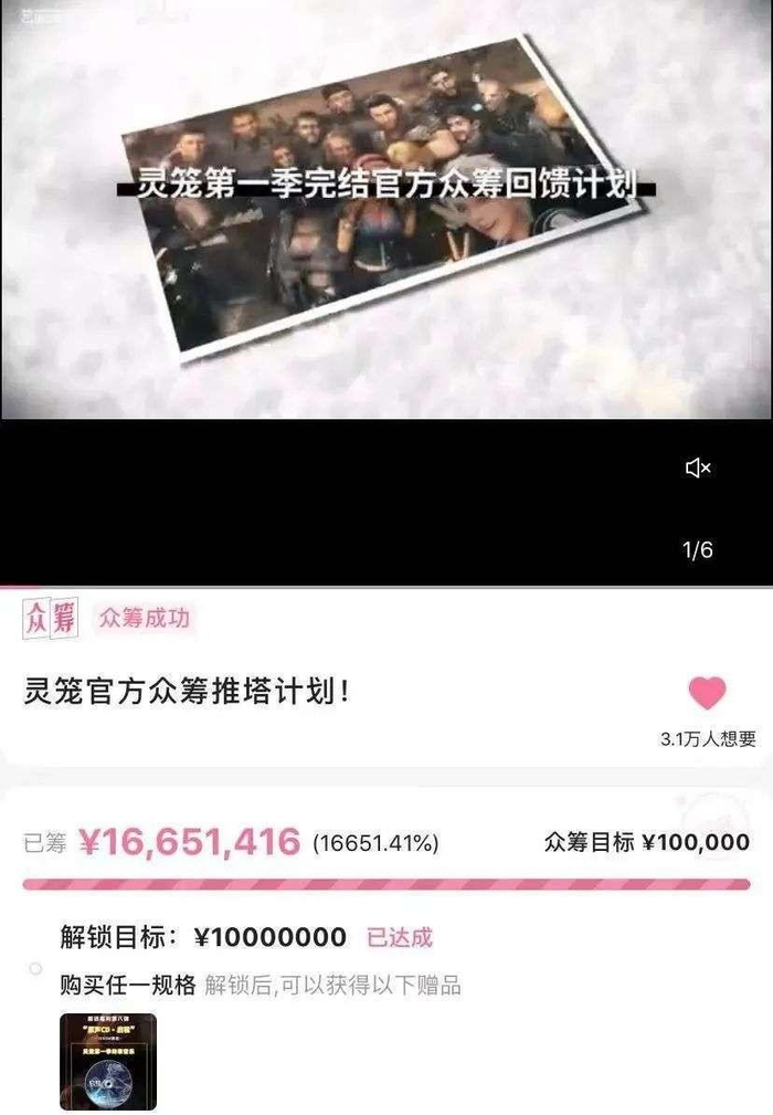 自2019年7月13日开播以来,截至目前《灵笼》已经在B站收获了高达9.6的评分,追番人数达871.1万,总播放量达5.5亿,稳稳占居国创区前列。不仅如此,《灵笼》曾在第一集在上线10分钟后,追番人数就冲上150万,衍生品--众筹项目31天众筹金额突破1665万,上播期持续霸榜,一举成为科幻类型国漫的代表之作。