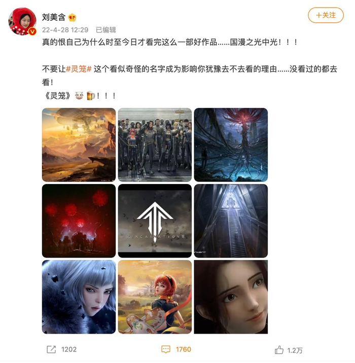 同时,不仅华语天后张靓颖献声《灵笼》全球主题曲《Incarnation》,老二次元朱亚文也和《灵笼》合作,用富有磁性的嗓音再现了动漫中九位不同人物,众多明星强强联手为观众带去了不少惊喜。即使到2022年,《灵笼》的影响还在持续。其中,今年话题度大热的艺人符龙飞,前不久发出自学唢呐扒谱《灵笼》的视频,配合《灵笼》的画面让人忍不住拍案叫绝;而另一位大众所熟知的美少女刘美含,则更是直接在社交平台狂赞《灵笼》为“国漫之光中光”,疯狂安利引来不少同好者在评论区热烈讨论。