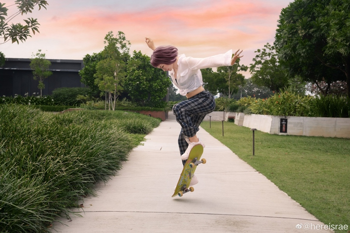 Rae是滑板爱好者。她经常身着短装,动若脱兔的在街巷间驾驭滑板穿梭而行,还曾担任2021中国滑板精英赛唯一虚拟星推官,2022微博滑板精英赛虚拟星推官。