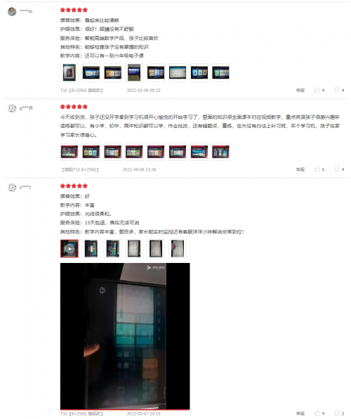 网友“ ****a”:终于收到了最新款的科大讯飞T10,孩子很开心地学习语文、学习英文……忙得不亦乐乎,我们家长看到孩子变得这么爱学习了,心里变得非常开心!这款机型的分辨率高达2160*1350,图片很清晰,具有很好的护眼功能,长时间看屏也不用担心孩子眼晴近视了!同时拥有8GB+256GB的大存储,很满意!希望T10能陪伴孩子学习进步,快乐学习!