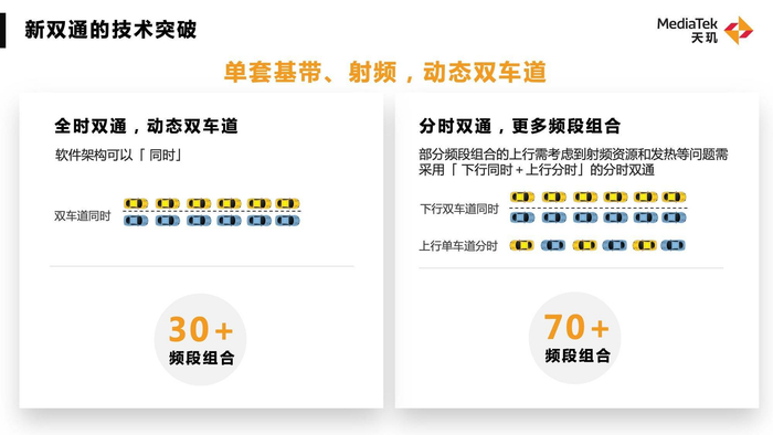 市场上常见的双卡双待真的好用吗?一卡通话,另外一张卡就会直接漏接电话或者断网。这其中涉及到一卡在通话时会占据全部的射频资源,导致另外一张卡无资源可用,就好像是我们在日常开车中碰到单车道的情况,无法满足两辆车并行前进。因此联发科为了改善双卡体验,通过三个维度来进行升级,赋予更多的使用场景、更多的频段以及更多的网络制式。