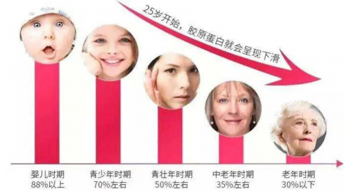 如果把饱满的皮肤比成有弹簧支撑的床垫,那么胶原蛋白就是其中起支撑作用的弹簧。有报道显示,人体从25岁起,胶原蛋白每年以1.5%的速率开始流失,45岁时流失胶原蛋白量约为30%[3]。一旦胶原蛋白流失,弹簧断裂,床垫塌陷,皮肤就会表现出皱纹、松弛下垂等衰老现象。