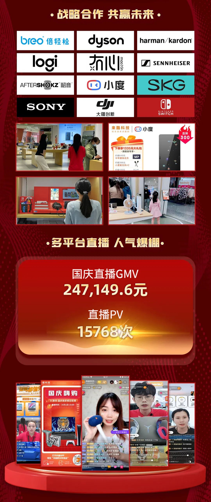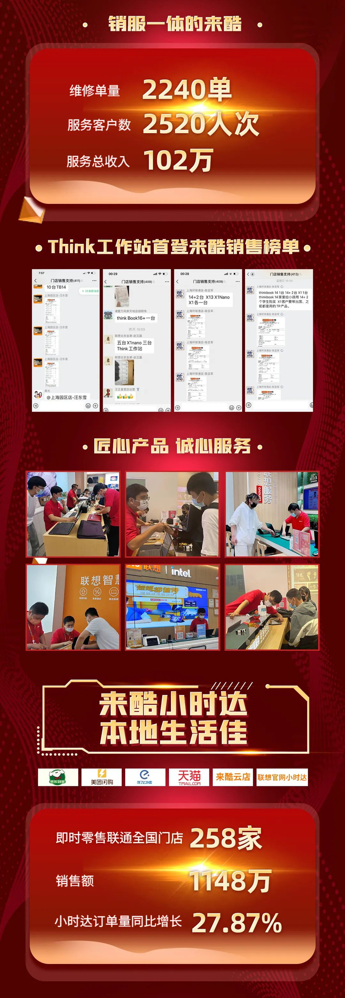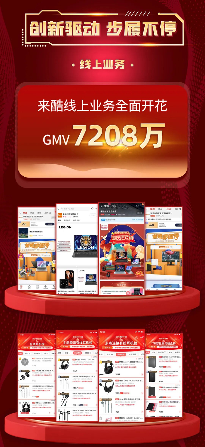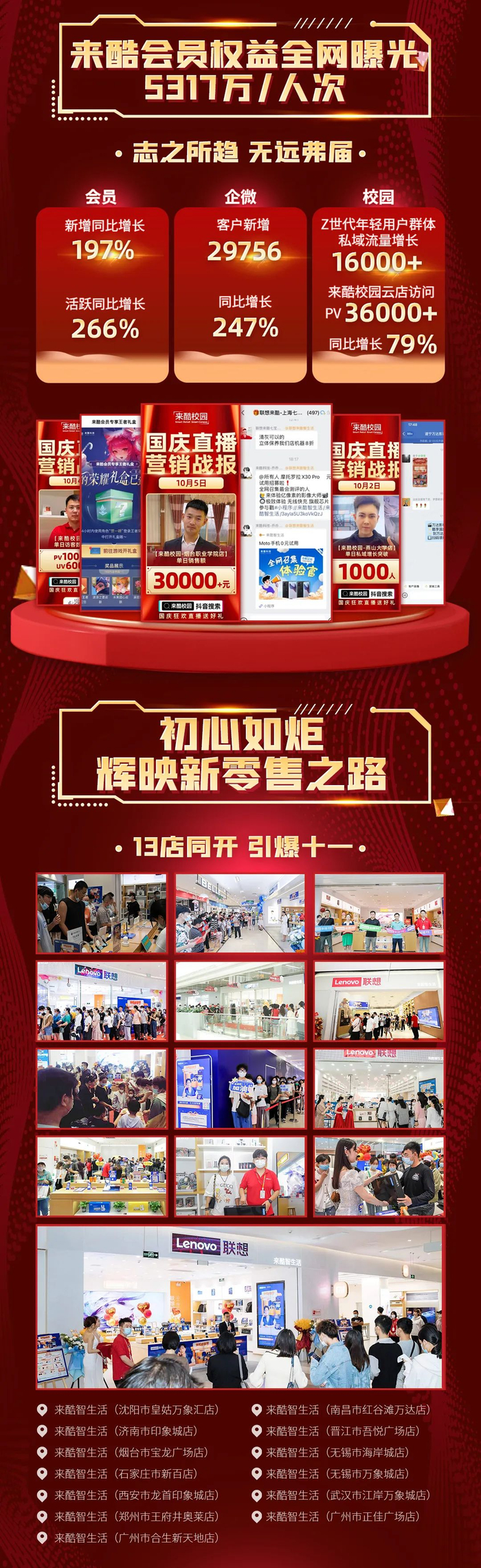 近年来,来酷作为新零售领域的独角兽企业,以独有的OMO全域智慧零售模式,将种类丰富的优质产品通过各种渠道展现在消费者面前,全时全域满足用户需求!新零售业态下的来酷融合精准营销,不断完善生态合作矩阵。刚刚过去的“十一”黄金周,来酷销售成绩再创新高,线上流量实现全域高速增长,再次交出高分答卷。截止2022年10月7日,来酷2022年 “十一”销售业绩战报重磅出炉。10月1日至10月7日期间,整体销售1.4650亿元、来酷小时达本地生活即时零售,联通全国258家门店,销售额1148万,小时达订单同比增长27.87%、Think工作站首登来酷销售榜单、线上业务全面开花,GMV7208万、会员权益全网曝光5317万人次、多平台直播,GMV247149.6元,PV15768次、销服一体共服务客户2520人,总收入102万、品牌获数百万曝光,粉丝新增同比达1885.15%,粉丝活跃互动环比达380.77%。令人惊艳倍增数据,真正体现出来酷作为智慧零售先锋的实力与底蕴。