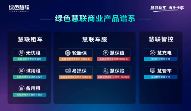 今年初绿色慧联推出了全新商业产品谱系,包含慧联租车、慧联车服、慧联智控三大板块。通过完整的商业产品布局,绿色慧联完成新能源物流车全生命周期运营管理的覆盖。
