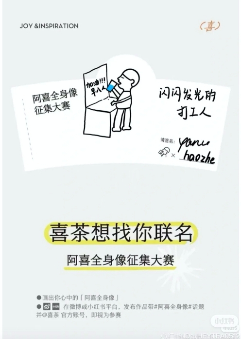 今年,喜茶首次主动发起阿喜全身像征集大赛后,收获了来自各平台用户的海量作品投稿,用户更加主动地将阿喜logo进行灵感创作和个性表达的窗口。这与喜茶充满灵感与喜悦的品牌精神形成了共振,而这种良性的互动也将逐渐沉淀成为喜茶独有的品牌资产。