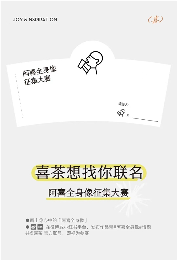 近日,喜茶官宣与粉丝“联名”,发起首届“阿喜全身像征集大赛”,并设立最高超过9999元价值的大奖,邀请粉丝以绘制喜茶logo——阿喜的全身像的方式参与这次“联名”。活动开始后,微博、小红书相关话题阅读总量已经超过千万,累计收到各平台网友作品数千份,被网友调侃为“喜茶迄今最大型联名现场”。