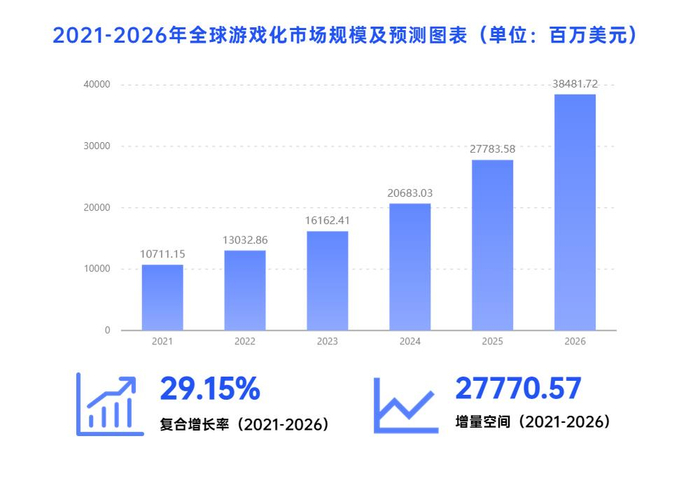 根据 Technavio 全球市场报告,2021年全球游戏化市场的价值为107.11亿美元,预计2026年将增长至384.81亿美元。