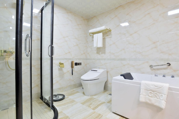 入住豪华酒店,欧式装修风格,尽显高端大气。客房内电视、电话、空调、衣柜、桌椅等配置齐全,应有尽有,保障用户体验。超大卫生间干湿分离,淋浴浴缸一应俱全,提供一次性洗漱用品。保护用户的隐私安全,让用户住的安心。