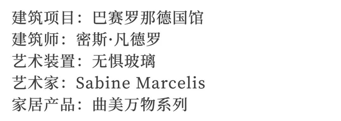 彩色艺术装置“无惧玻璃”是密斯·凡德罗基金会联合艺术家萨宾·马塞利斯在巴赛罗那世博会德国馆中展出的作品,将两把中式座椅在空间中轻巧放置,形成雕塑感与功能性的展示,东西方人文生活的艺术观相融合,无声留白,不凡气质中自带力量。