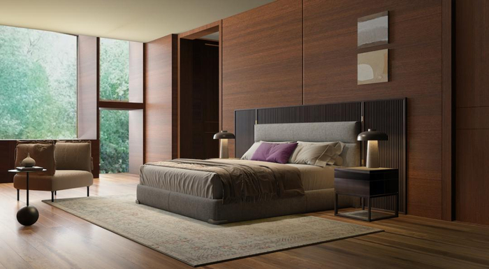 室内家具选取极具东方格栅式设计的床背景,辅以有温度质感的布艺床背,单体的紫色休闲沙发,搭配以带有年代感的波斯风格地毯。就像这栋房子最初的房主般,窗外的自然、书屋人文的滋养无不在其中,纯粹、温暖,极致优雅。