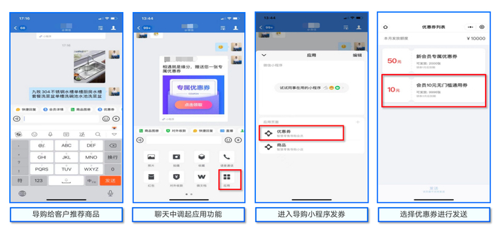 通过于发送优惠券等,作为一个让顾客去主动添加导购的抓手。举个例子,顾客在添加了导购的企业微信之后,便可以获得一张优惠券。