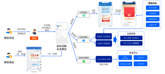通过企业微信实现导购与消费者的联系沟通。借助企业微信的即时沟通能力,导购可在顾客离店后,持续与消费者互动。